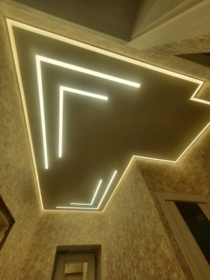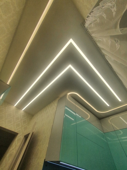 Световые линии могут иметь различные конфигурации : по прямой, от стены до стены, они могут обрываться по середине потолка, могут пересекаться между собой, могут плавно переходить со стены на потолок
